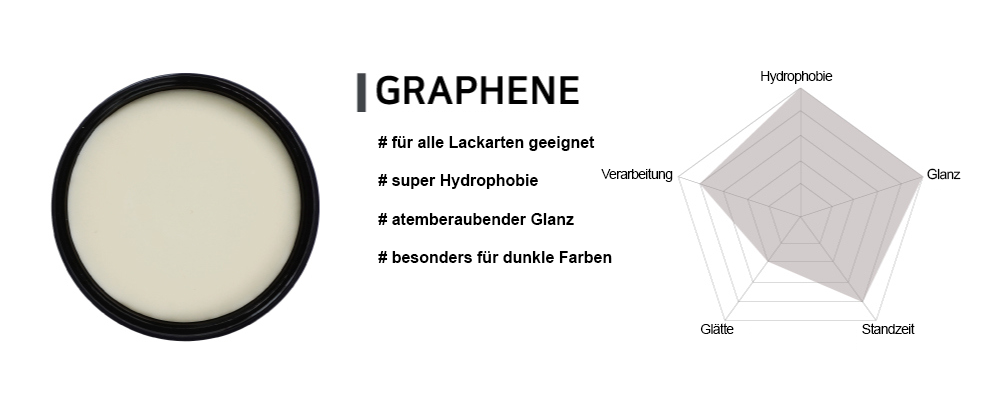Unser mit Graphen angereichertes Wachs verleiht dunklen Lackoberflächen einen tiefen, dunklen Glanz und hellen Oberflächen eine reiche Farbgebung. Die Graphen-Additive sorgen für eine wasserabweisende, seidig glatte Oberfläche und Wärmebeständigkeit. Graphenwachs ist der perfekte Weg, um einen atemberaubenden Glanz und beeindruckende visuelle Effekte zu erzielen.
